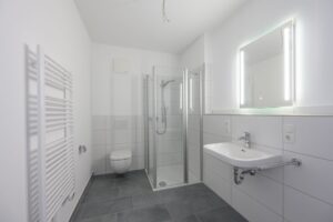 Zu den Apartments zählen drei einladende Zimmer. Das Objekt ist barrierefrei zugänglich und durch einen Fahrstuhl gelangen Sie bequem in die höher gelegenen Stockwerke oder in den Keller. Die Terrasse, der Balkon oder die Dachterrasse laden zum Entspannen und Sonne tanken ein. Alle Fenster haben Jalousien. Alle Wohnungen sind mit Fußbodenheizung ausgestattet. Eine Einbauküche, sowie ein Stellplatz und ein Kellerraum stehen Ihnen außerdem zur Verfügung. Der Stellplatz ist fester Bestandteil der Wohnung. Weiterhin gehört zu jeder Wohnung ein Stellplatz im Fahrradkeller mit eigener abschließbarer Steckdose (eBike).